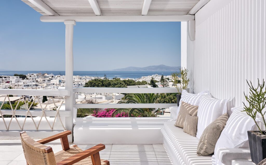 Les suites disposent de kitchenettes, idéales pour des séjours plus autonomes. Un choix parfait pour les voyageurs actifs en quête d’un hotel Mykonos luxe au style décontracté.